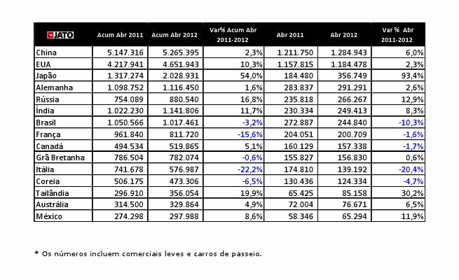 Com esse resultado, o Brasil fechou abril na sétima colocação do ranking mundial, atrás de Índia (6ª) e Rússia (5ª), países "emergentes" que formam o chamado Bric (sigla de Brasil, Rússia, Índia e China). Em 2012, os indianos viram as vendas de automóveis e comerciais leves subirem 11,7% (1.141.806 modelos), enquanto os russos avançaram expressivos 16,8% (totalizando 880.540 unidades). No acumulado do ano, o Brasil ainda supera a Rússia, mantendo até agora a sexta colocação na lista da Jato. No entanto, Índia e Alemanha, atual 5º lugar com 1.116.450 carros, já começam a abrir vantagem.
