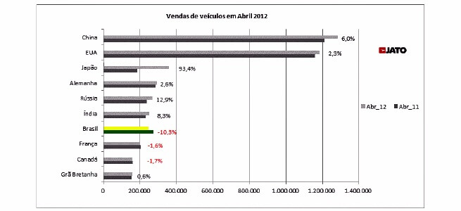 O mais recente balanço mensal da Jato Dynamics, referente ao mês de abril, apontou um cenário nada positivo para o Brasil em 2012. Segundo os números divulgados pela consultoria especializada na indústria de carros, o mercado brasileiro recuou 10,3% nas vendas de abril, somando 244.840 unidades contra as 272.887 emplacadas no mesmo mês de 2011. No acumulado de janeiro a abril desse ano, o tombo foi um pouco menor, de 3,2%, com 1.017.461 veículos vendidos ante os 1.050.566 entregues no mesmo período do ano passado.